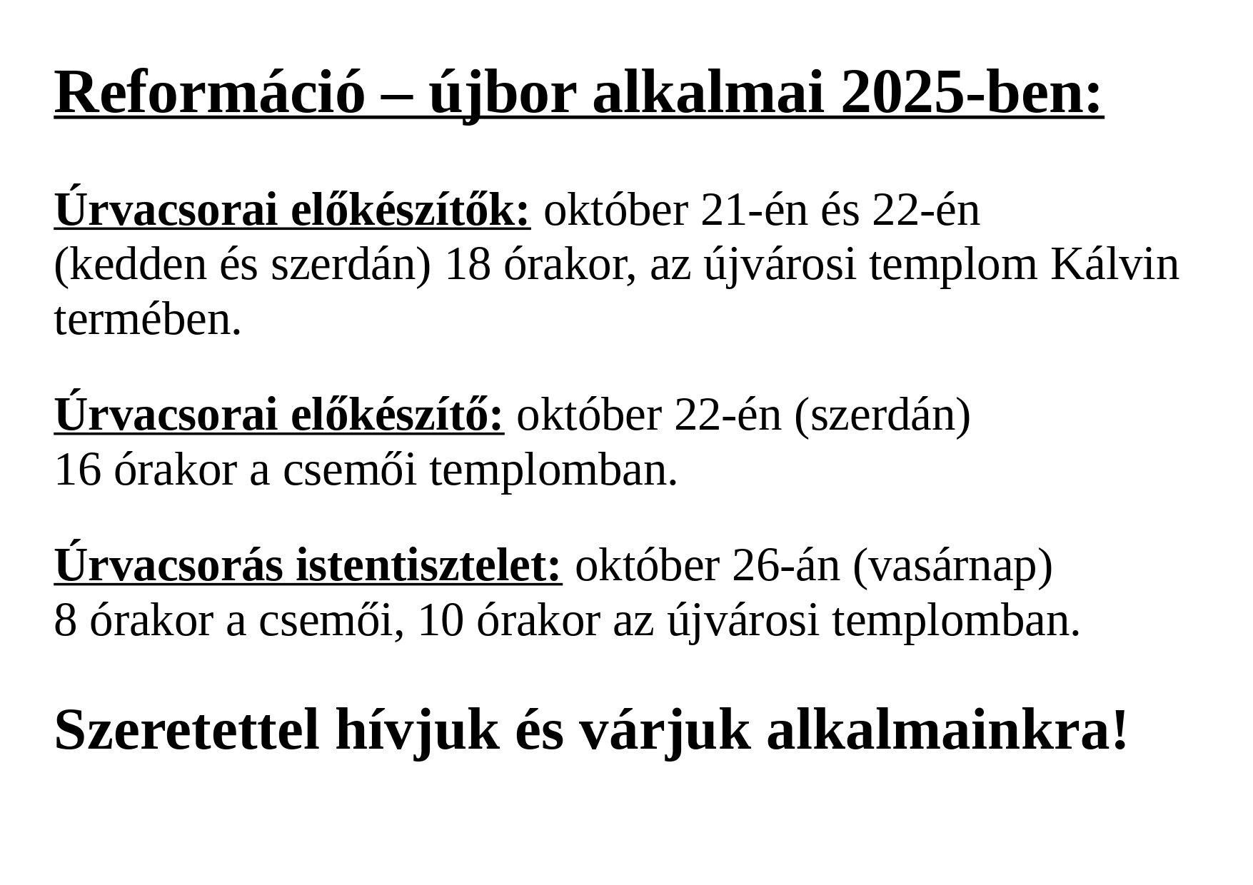 Hívogatunk közösségünkbe mindenkit, aki fontosnak érzi a gyülekezetünk lelki növekedését és a környezetünkben élő emberek lelki ébredését, Istenhez való visszatalálását, hitbeli növekedését.